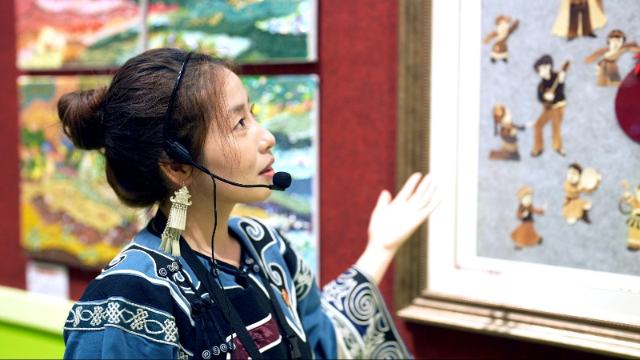 中國婦女兒童博物館內,身著彝族傳統服飾的依火伍牛正在向觀眾講解著春蕾女童的繪畫作品。新華網攝