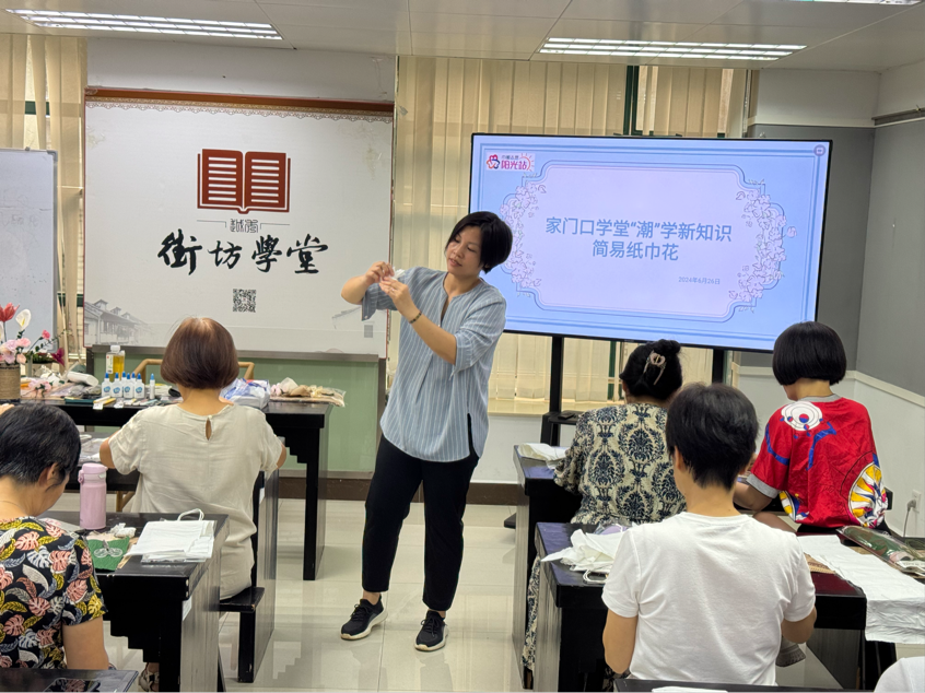 在鹽運西社區,街坊們向巾幗志愿者學習制作簡易紙巾花。新華網 關錦恒 攝