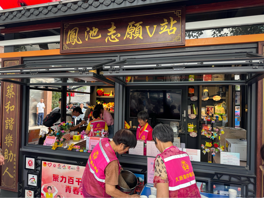 在鳳池志愿V站,志愿者們正在工作中。新華網 關錦恒 攝