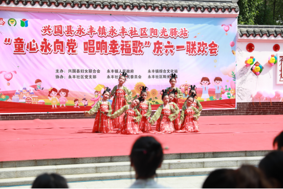 5月26日,在江西省贛州市興國縣永豐鎮永豐社區陽光驛站舉辦的六一聯歡會活動現場,身著漢服的小朋友們在表演歌舞節目。新華網李科燊 攝