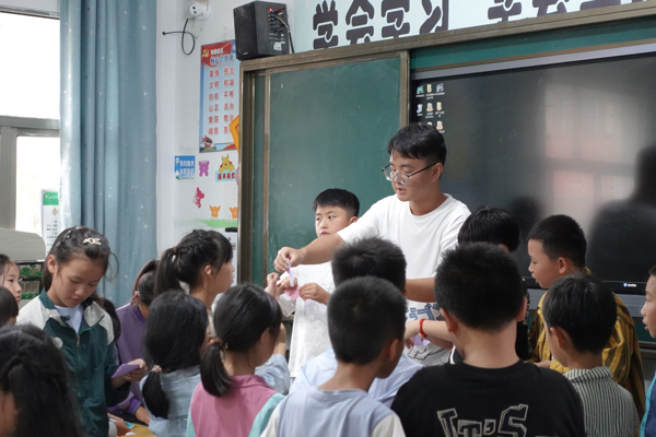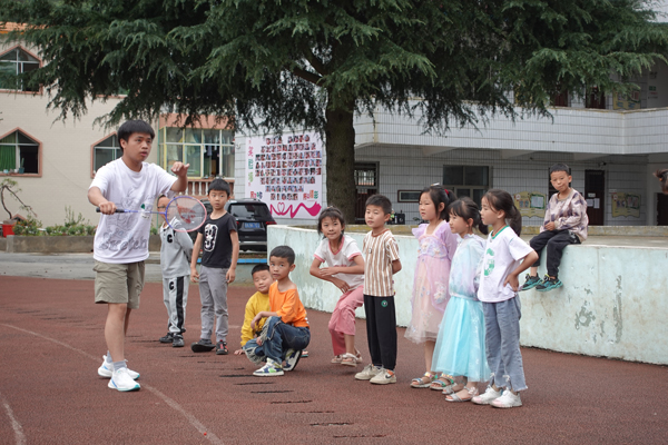 “大家好,我叫萬陽陽,你們可以叫我陽哥?!比f陽陽頂著一頭自然蓬松的短發,皮膚是健康的小麥色,聲音低沉渾厚,能代替鈴聲將散落在操場上的孩子們喚回教室。在武漢讀書的他一直念叨著家鄉的好,在得知能有回家鄉開展兒童關愛服務活動的機會后,便毫不猶豫地報了名,還拉上了高中同學鐘厚鳴一起。兩位男生在高中時便擔任班里的正副班長,配合起來默契十足,在結伴隊伍中則負責隊內的后勤和策劃工作。