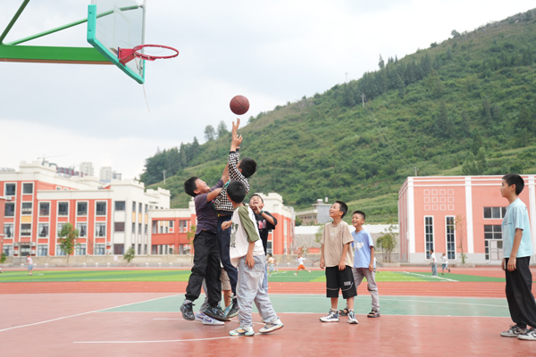 貴州省盤州市沙陀小學的學生們在籃球場上打籃球。