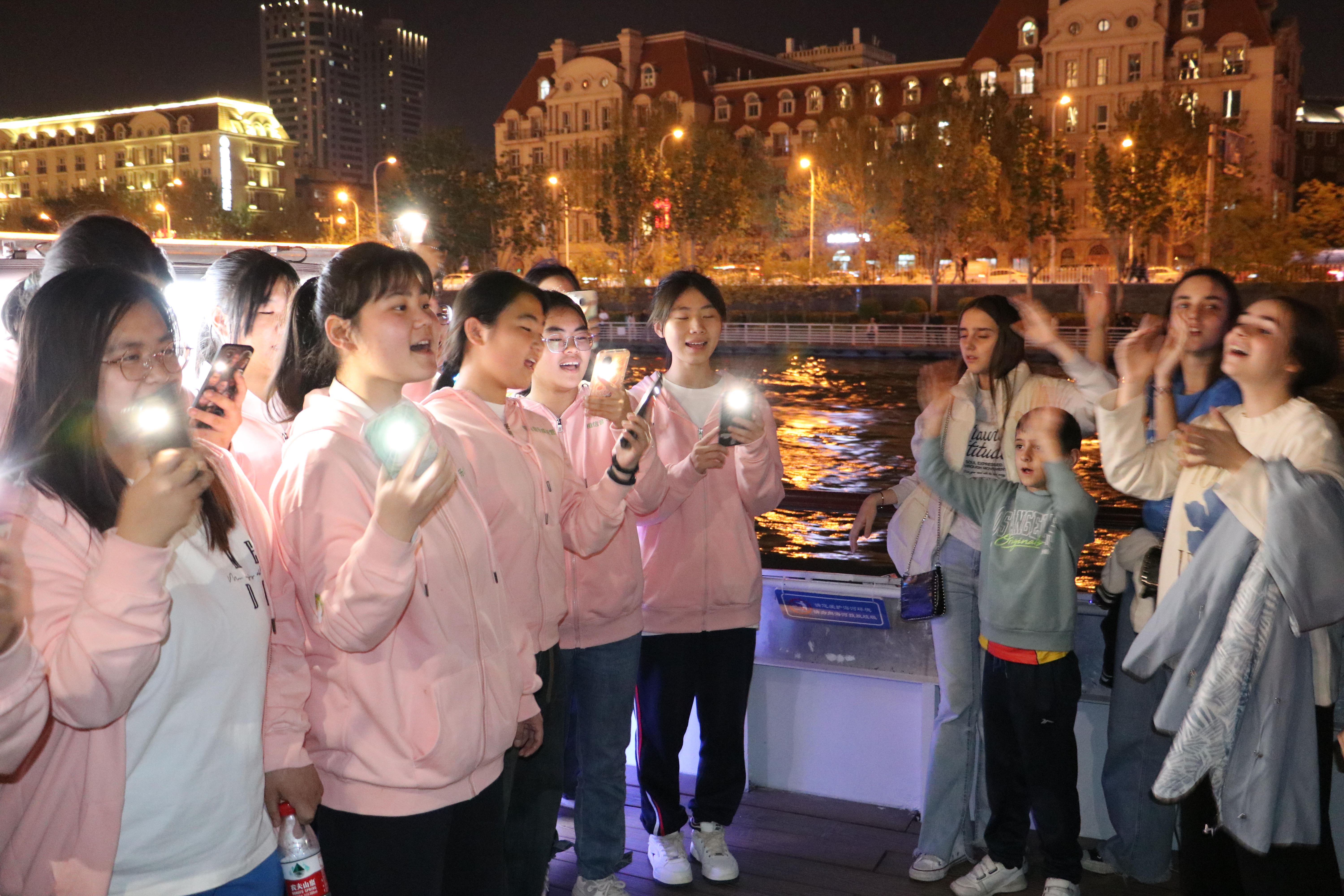 華燈初上時,同學們登上海河游船,開啟了一場城市文化探索之旅。游船途經天津之眼摩天輪、解放橋、津灣廣場等地標建筑,講解員娓娓道來海河與天津城市發展之間的血脈聯系?!斑@是我第一次從水上欣賞天津夜景,感覺很不一樣?!毙■└锌?。