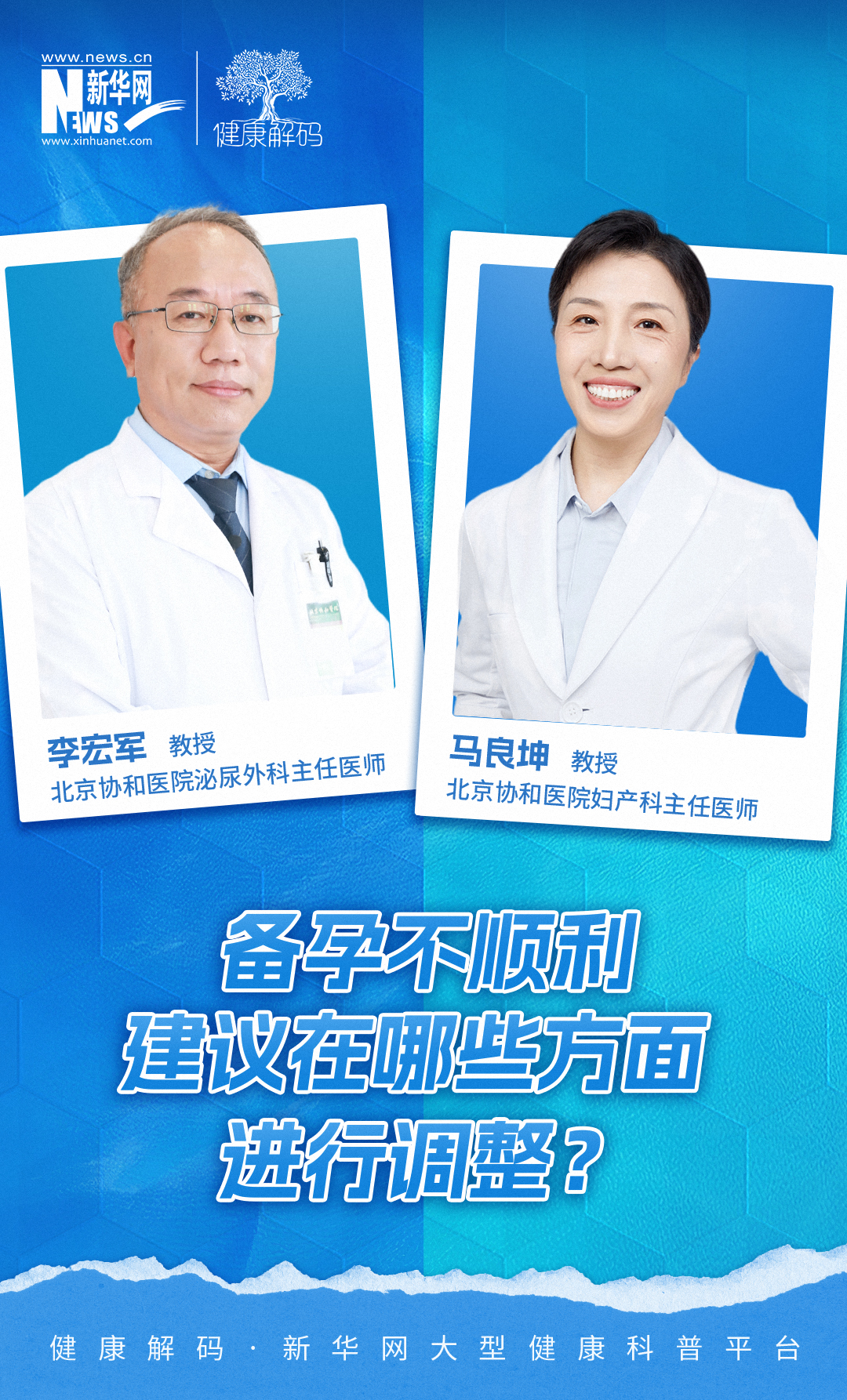 女性和男性不孕的常見原因分別有哪些,如何進行科學的診斷和治療?本系列節目我們邀請了北京協和醫院婦產科主任醫師馬良坤教授、北京協和醫院泌尿外科主任醫師李宏軍教授共同分享《備孕不順利 建議在哪些方面進行調整?》。