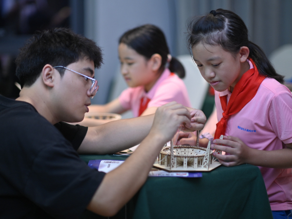 (9月13日,同學們在“天眼 FAST 天文大課堂”上搭建FAST等比例縮小的木質模型。)