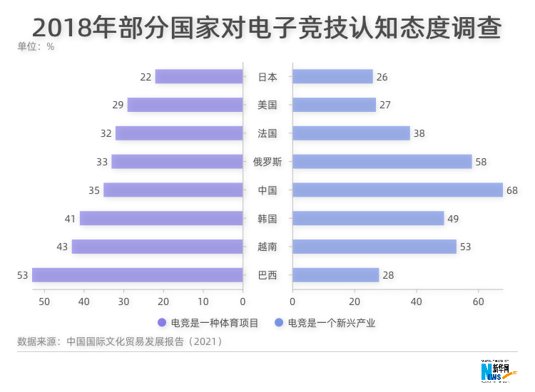 ????? 企鵝智庫《世界與中國:2019年全球電競運動行業發展報告》調查顯示,2018年對包括中國在內的八國社會對電子競技認可度的調查中,中國認為“電競是一種體育項目”的人數占35%,處于中間水平,而認為“電競是一個新興產業”的人數占68%,位列八國之首。