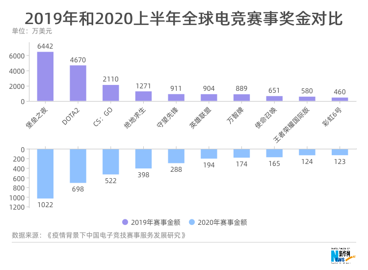 ????? 在所有調整措施中,直接取消比賽對以舉辦方為首的賽事服務體系影響最大,延期舉辦的影響相對較小,而線上舉辦和線下無觀眾舉辦的影響也處于較為嚴重的水平。線下賽事舉辦方和承辦方的主要收入來源除了融資和贊助外,就是觀眾門票收入和相關線下服務收入,而線上舉辦和線下無觀眾舉辦都無法獲得這筆收入,因此大部分舉辦方和承辦方都處于虧損狀態。為了應對赤字問題,除了通常的裁員、減少工時外,賽事舉辦方一般還通過減少賽事支出的方式來開源節流,最重要的一環就是賽事獎金縮減,因此2020年電競賽事獎金大多縮水嚴重。 從下表中可以看出,2020年上半年排名前十的電競游戲賽事總共貢獻了超過3708萬美元,和2019年全年貢獻值18888萬美元相比,僅占比19.6%。