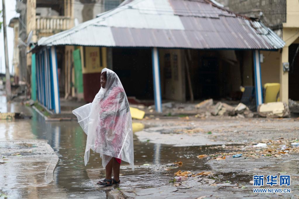 8月17日,一名女子身披塑料布站在海地萊凱的街道上。