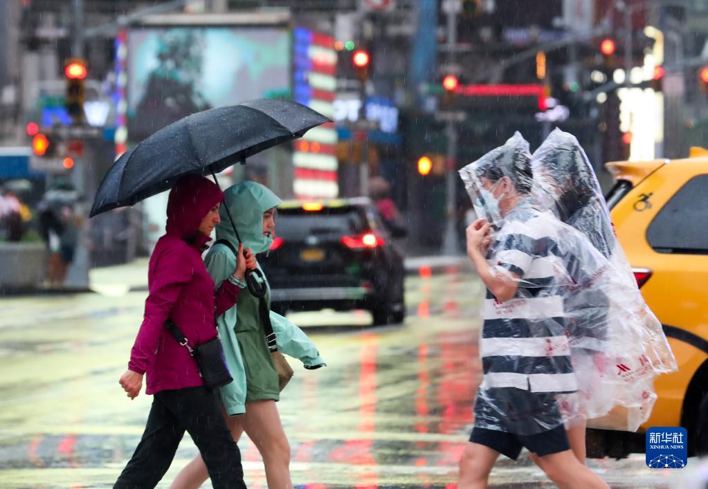 8月22日,人們行走在雨中的美國紐約時報廣場上。受熱帶風暴“亨利”影響,美國紐約當日迎來降雨天氣。新華社記者 王迎 攝