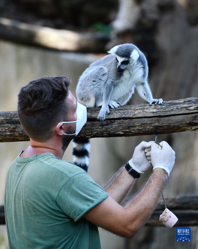 8月26日,意大利羅馬動物園的工作人員為環尾狐猴送去冰凍果蔬。