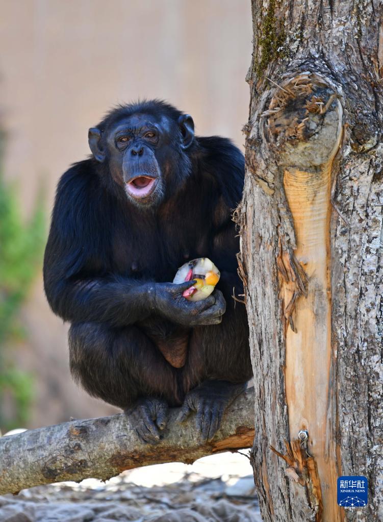 8月26日,一只黑猩猩在意大利羅馬動物園享用冰凍食物。