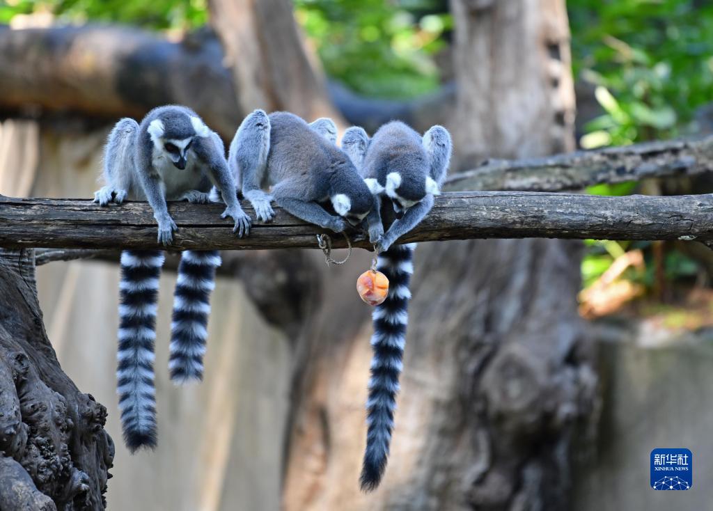 8月26日,環尾狐猴在意大利羅馬動物園準備享用冰凍果蔬。