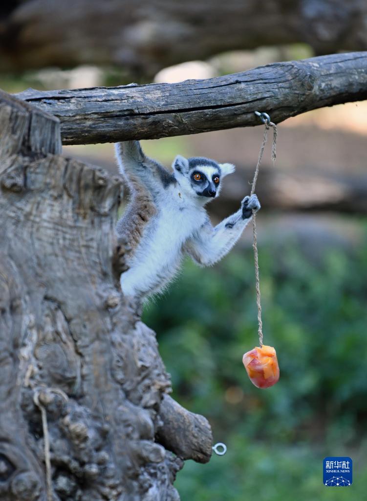 8月26日,一只環尾狐猴在意大利羅馬動物園準備享用冰凍果蔬。