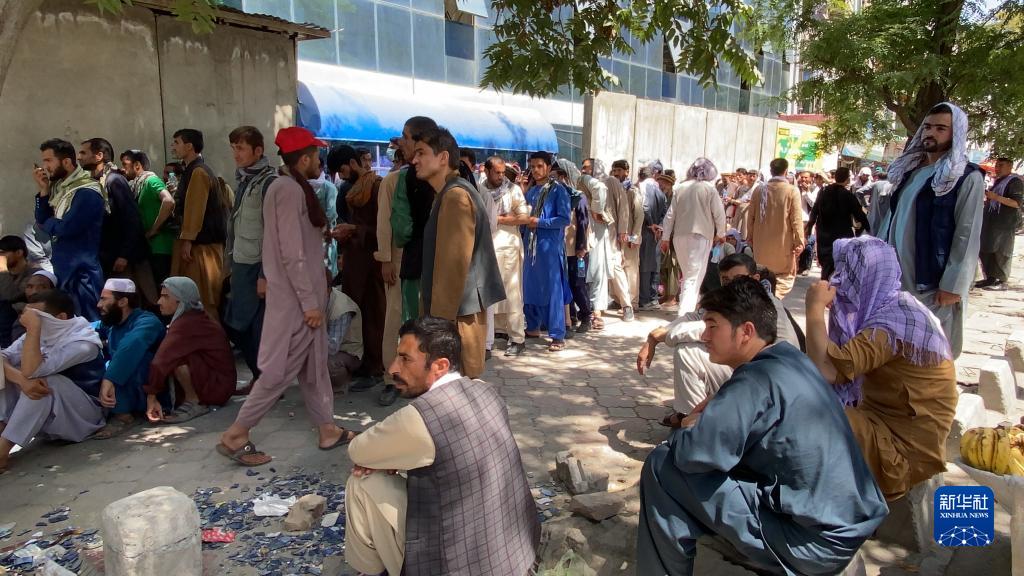 8月26日,人們在阿富汗喀布爾一家銀行外排隊。