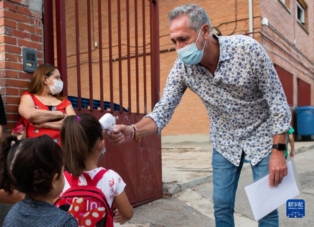 9月8日,一名老師在西班牙馬德里一所學校外為學生測量體溫。