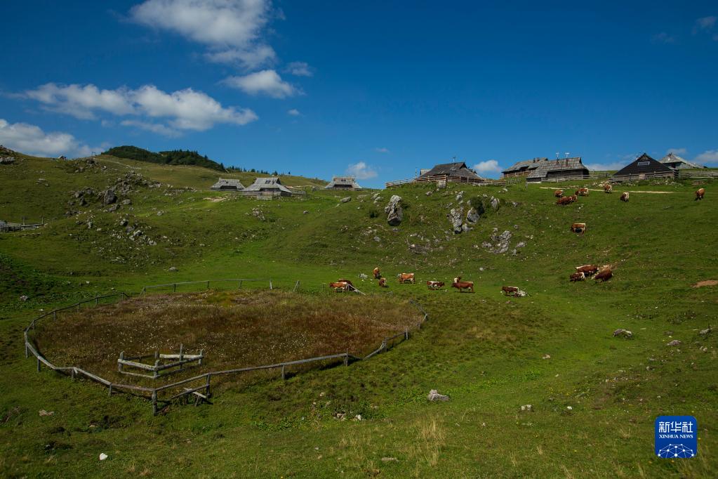 這是9月8日在斯洛文尼亞維利卡普拉尼那高地牧民定居點拍攝的傳統木屋和奶牛。