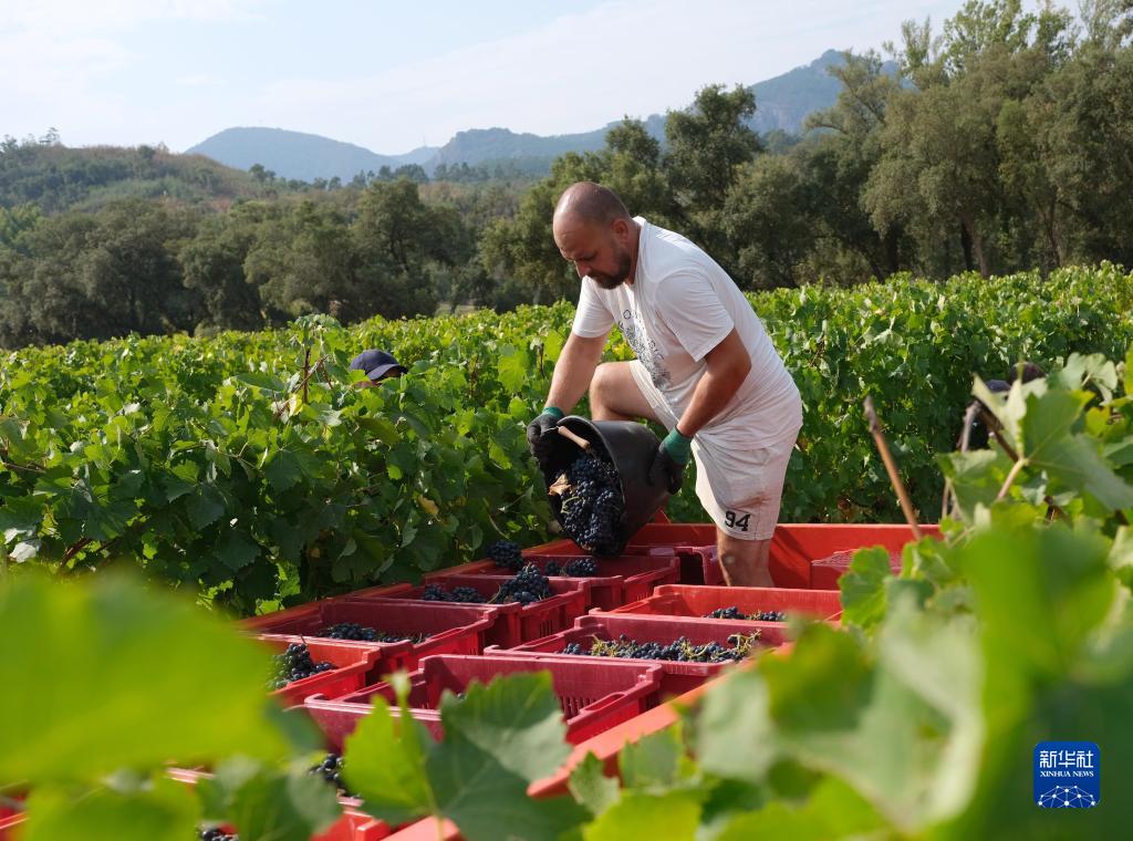 9月9日,在法國南部濱海阿爾卑斯省的芒德略拉納普勒,果農采摘用來釀酒的葡萄。