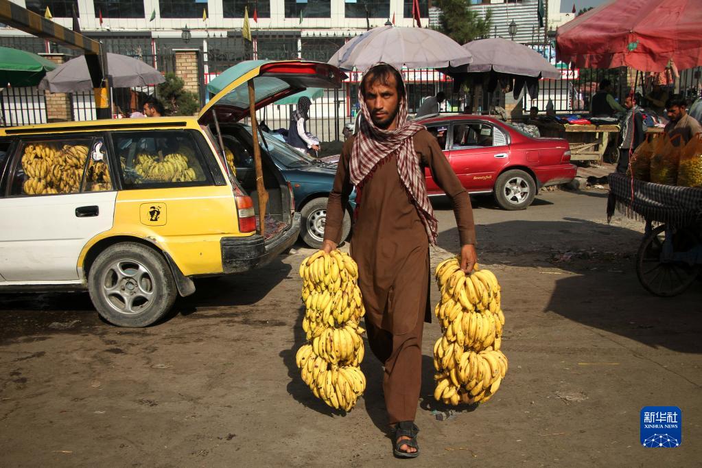 9月15日,一名阿富汗男子拎著香蕉走在喀布爾街頭。