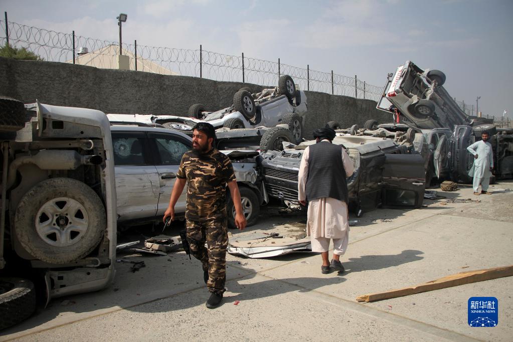 9月20日,在阿富汗喀布爾機場,塔利班人員走過損毀的汽車。