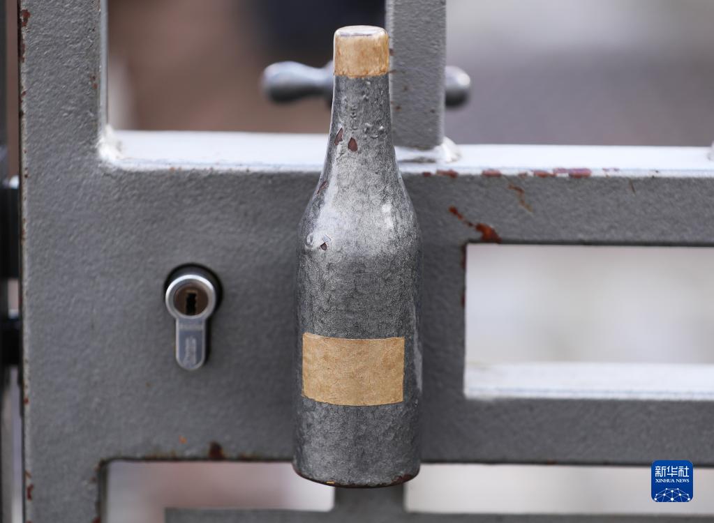 這是10月6日在法國巴黎蒙馬特高地葡萄園拍攝的酒瓶形狀的門把手。
