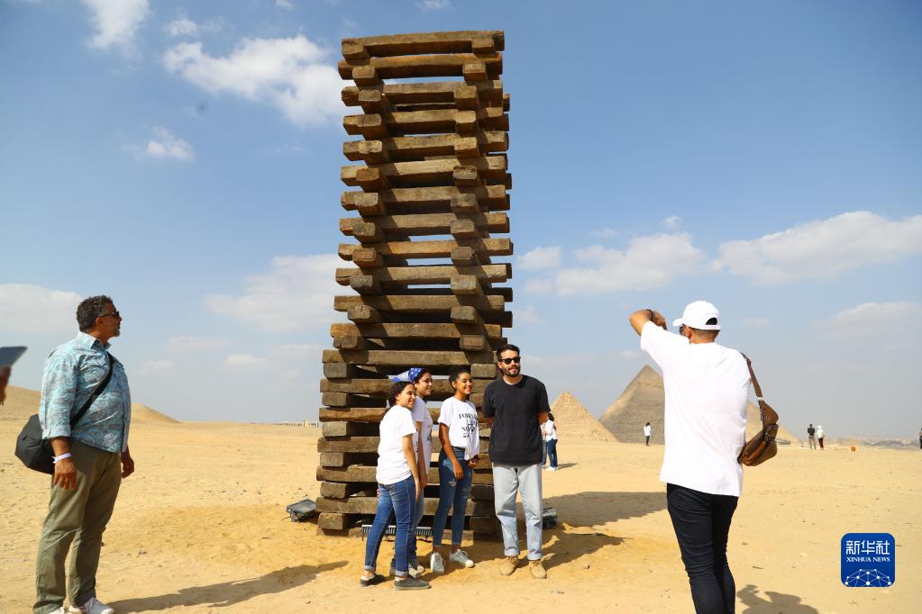 10月21日,在埃及吉薩金字塔景區舉辦的藝術展上,游客在一件藝術作品前留影。
