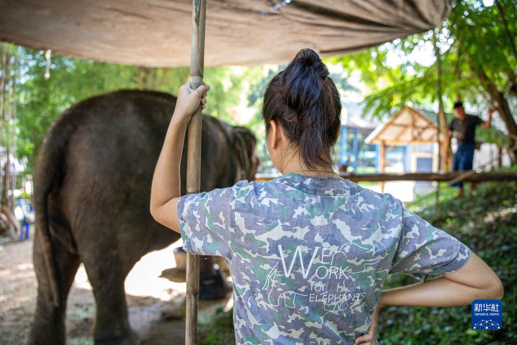 10月28日,工作人員在泰國南邦府的大象保護中心給一頭受傷的大象支起遮陽棚。