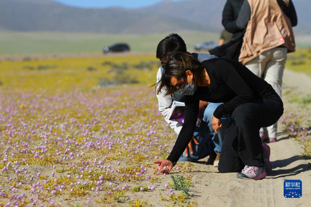 10月13日,在智利北部的阿塔卡馬沙漠,游人欣賞沙漠中開花的美景。