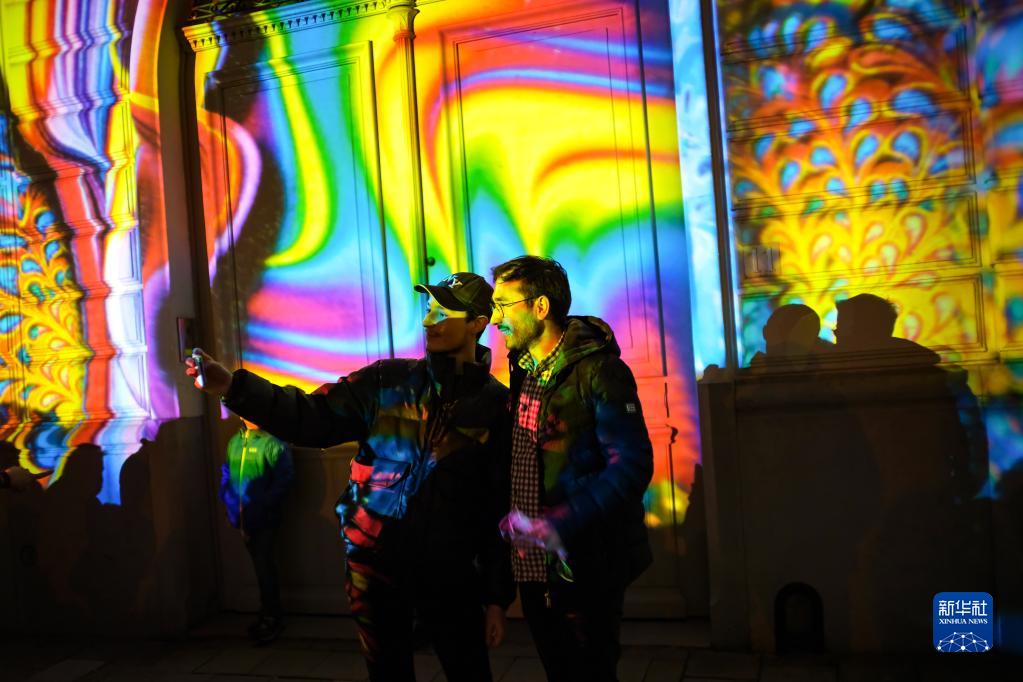 11月11日,人們在比利時根特燈光節上游覽時自拍合影。