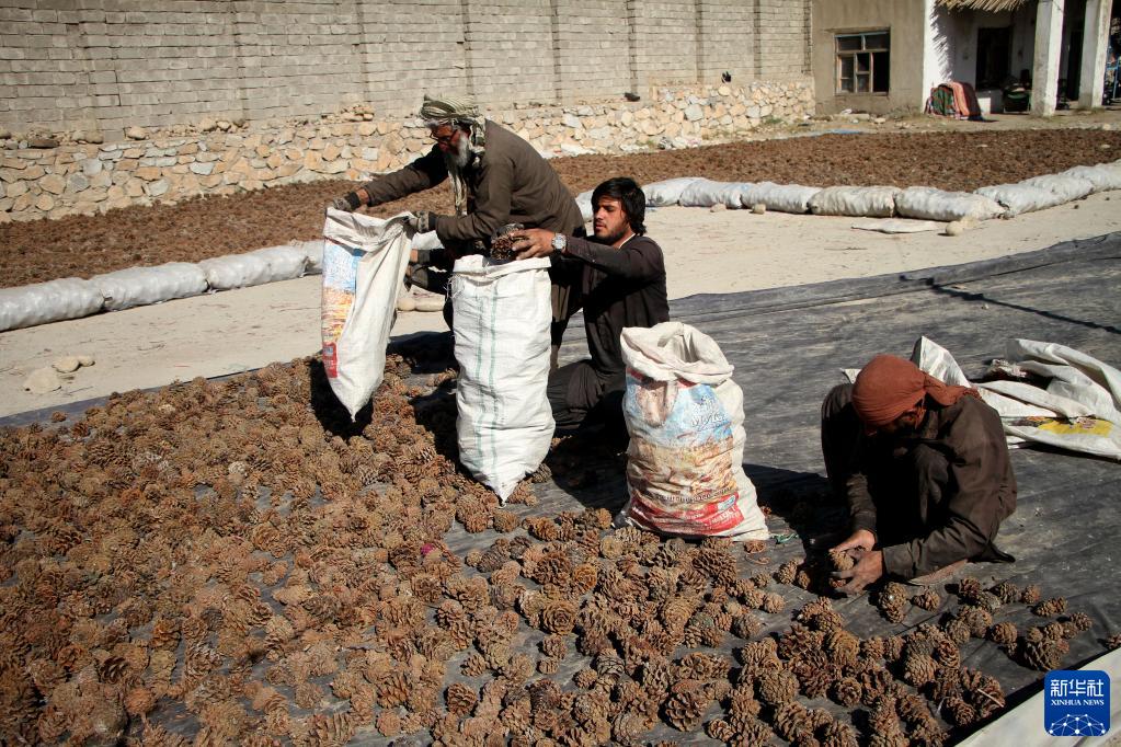 11月12日,在阿富汗米特拉姆,人們將松塔裝袋。