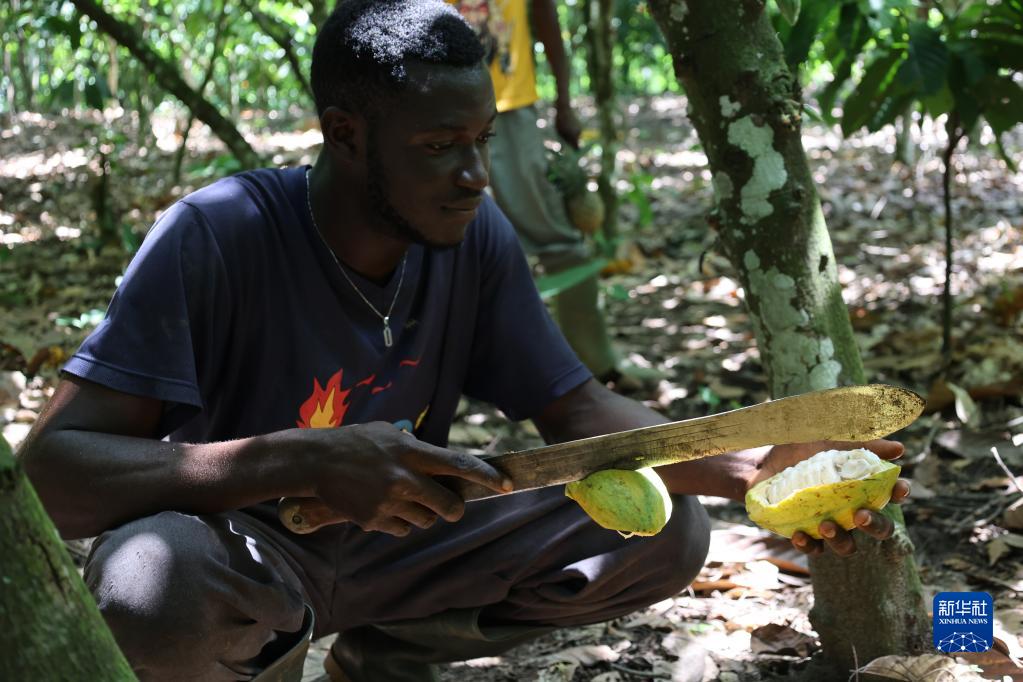 11月15日,在加納東部省的一處可可種植園,一名種植戶在切割可可果實。