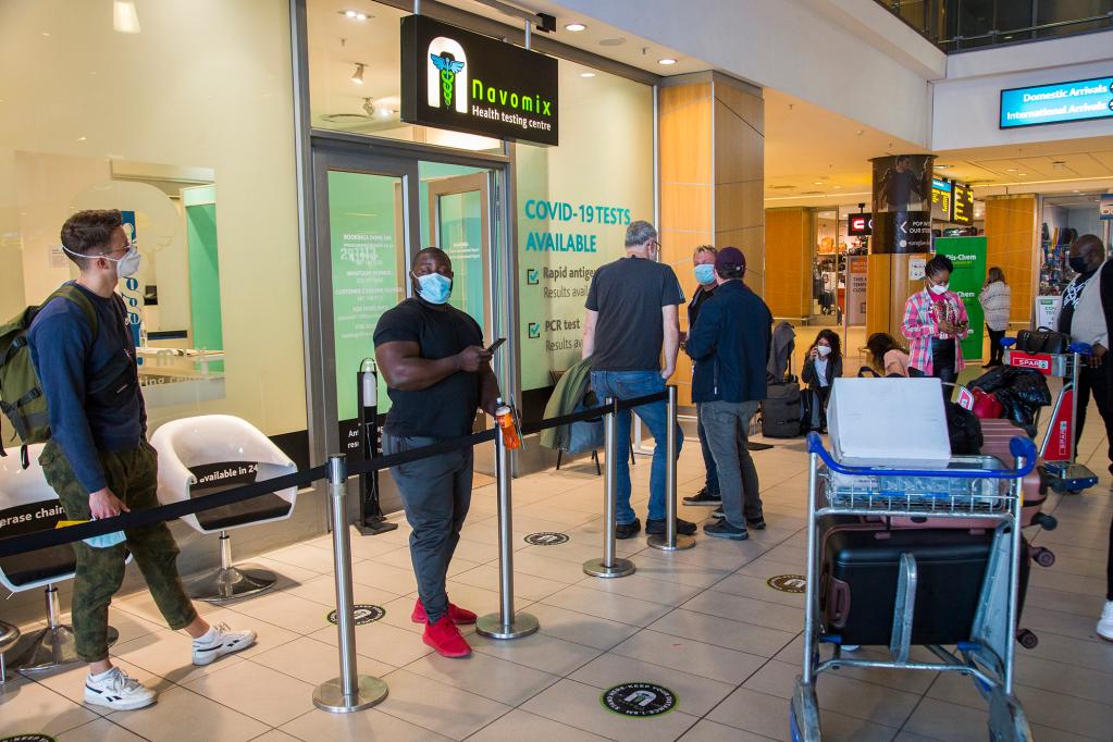 11月29日,旅客在南非開普敦國際機場等待接受新冠病毒檢測。為防范新冠變異病毒奧密克戎毒株傳播,多國近日對南非等非洲國家的航班和旅客實施入境限制,并升級防控措施。新華社發(弗克攝)