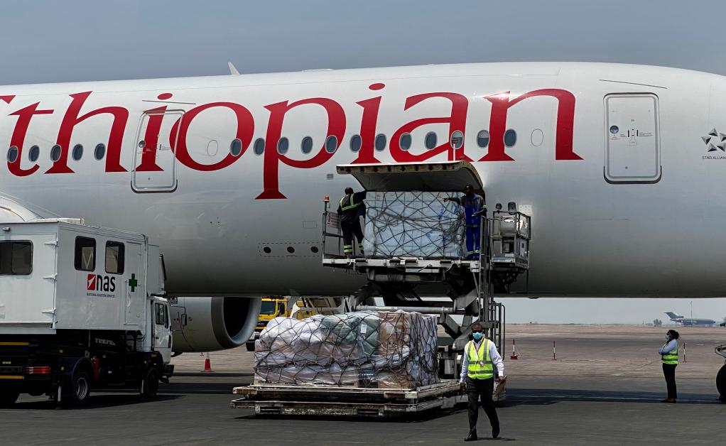 9月29日,在剛果(金)首都金沙薩恩吉利國際機場,工作人員卸載中國援助的科興新冠疫苗。新華社發(阿蘭·烏亞卡尼攝)