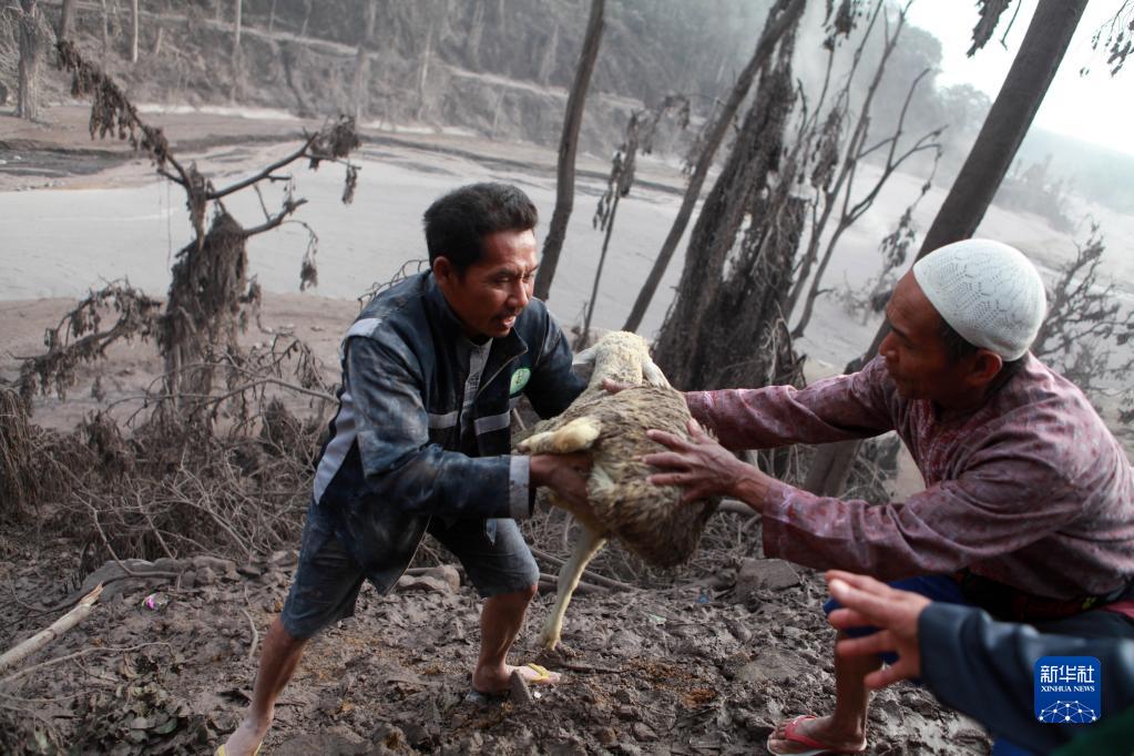 12月5日,在印度尼西亞爪哇島東部盧馬姜,人們在火山噴發后營救綿羊。