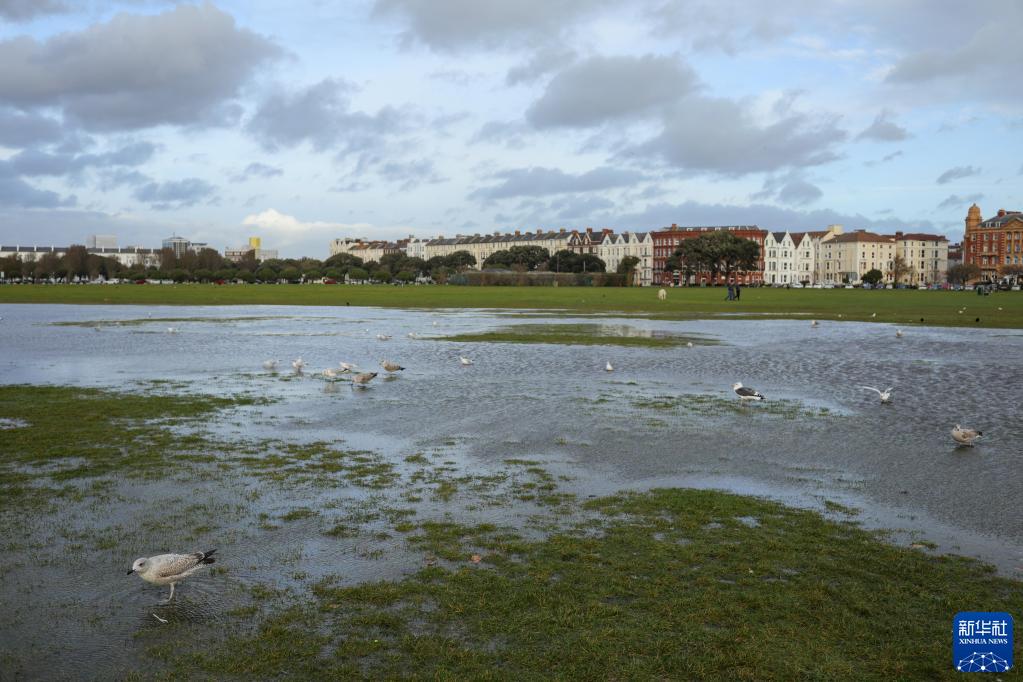 這是12月8日在英國樸次茅斯拍攝的一個海濱公園里的積水。