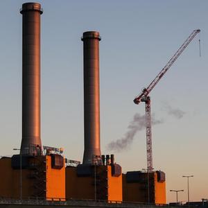 2021年10月9日在德國首都柏林拍攝的一座正在拆除煙囪的熱電廠。該熱電廠為實現碳中和目標在拆除廠內的三座煙囪及鍋爐房。(新華社記者單宇琦攝)