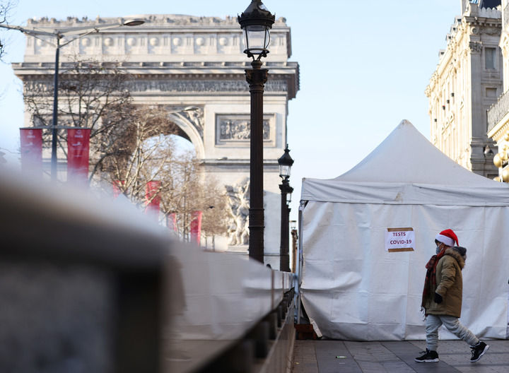 12月23日,一名兒童走過法國巴黎凱旋門附近的一處新冠病毒檢測點。新華社記者 高靜 攝