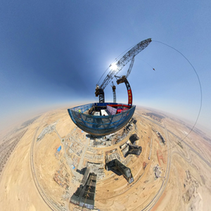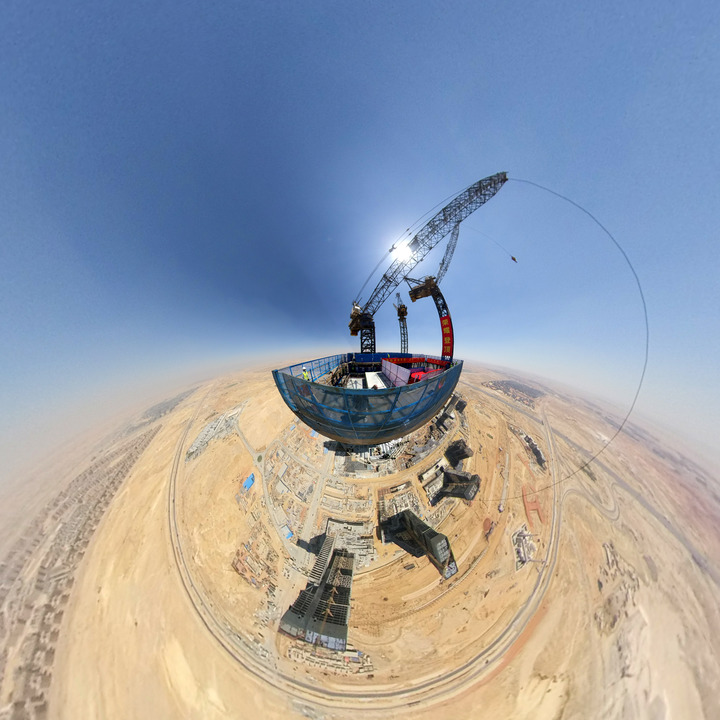 2021年6月17日拍攝的埃及新首都中央商務區標志塔主體建筑封頂建設現場(全景相機拍攝)。新華社記者隋先凱攝