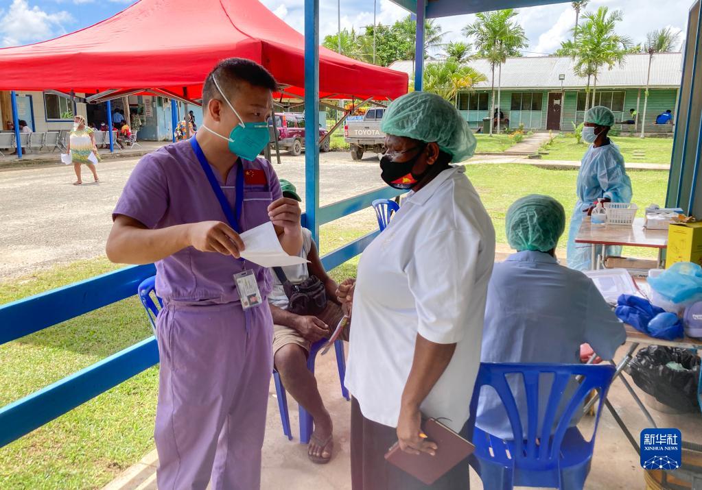 2021年8月25日,在巴布亞新幾內亞新愛爾蘭省卡維恩總醫院,中國援巴新醫療隊隊員向當地醫護人員介紹疫苗接種注意事項。新華社發(中國援巴新醫療隊供圖)
