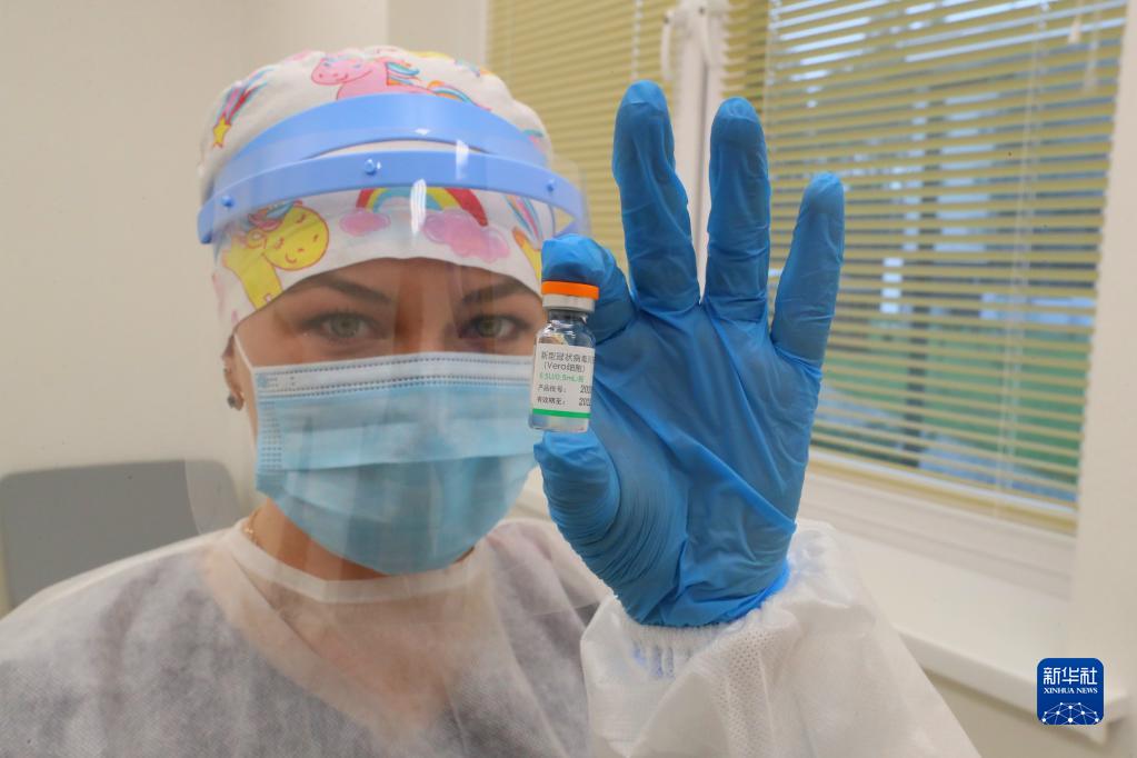 2021年4月16日,在白俄羅斯首都明斯克郊區的中白工業園,醫務人員展示中國國藥集團生產的新冠疫苗。當日,中白工業園開發公司、管委會及部分居民企業的員工開始接種中國政府援助白俄羅斯的新冠疫苗。新華社發(任科夫 攝)
