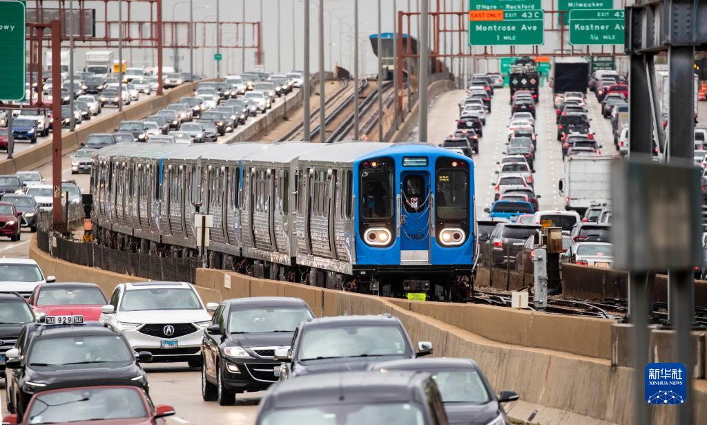 2021年5月6日,掛有7000系列車廂的地鐵列車在美國芝加哥載客試運行。7000系列地鐵車廂由中國中車青島四方機車車輛股份有限公司(中車四方)在美國制造組裝。新華社發(喬爾·萊納 攝)