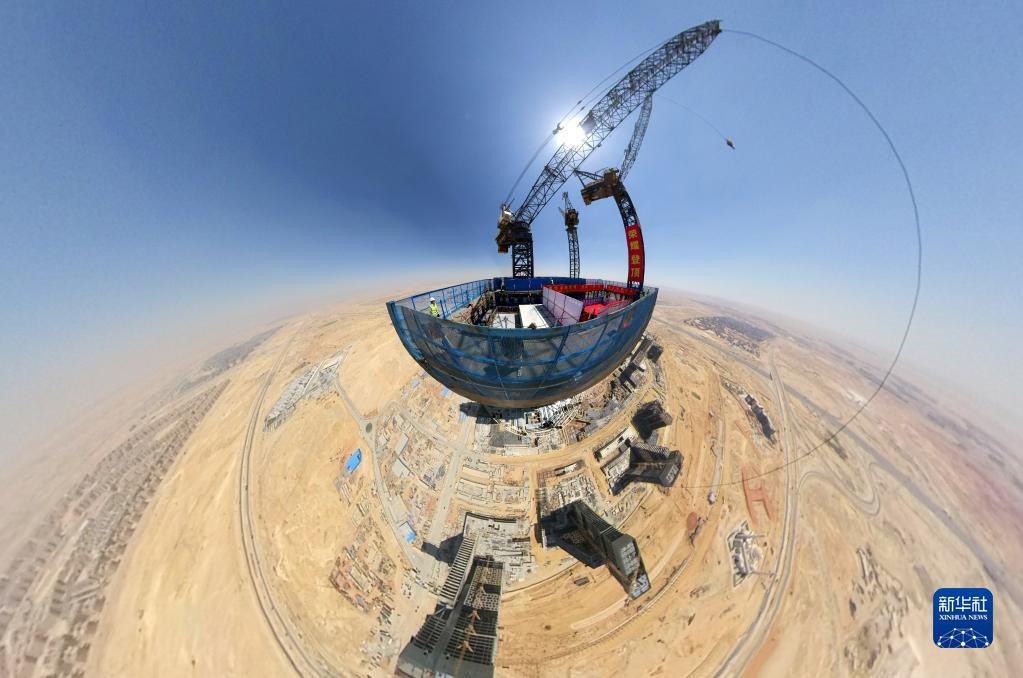 這是2021年6月17日在埃及開羅附近拍攝的埃及新行政首都中央商務區標志塔(全景相機拍攝)。埃及新行政首都中央商務區位于首都開羅以東約50公里處,由中國建筑股份有限公司埃及分公司承建。新華社記者 隋先凱 攝
