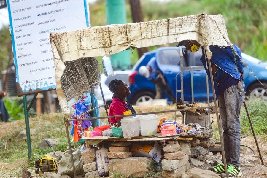 ↑2021年7月28日,在肯尼亞首都內羅畢街頭,顧客在一處小攤前買東西。