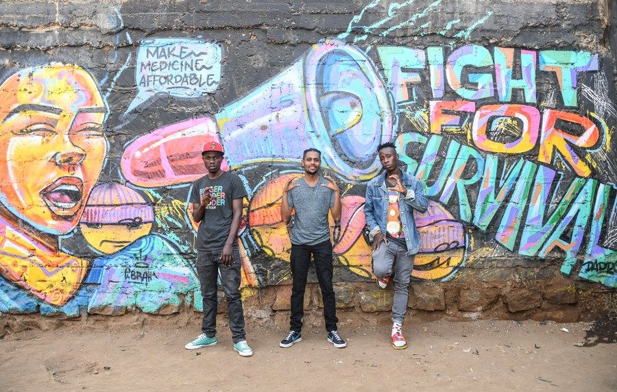 ↑2021年7月27日,“賽普勒斯”樂隊成員在肯尼亞首都內羅畢的馬薩雷貧民窟的一面涂鴉墻前擺出樂隊的代表性手勢。