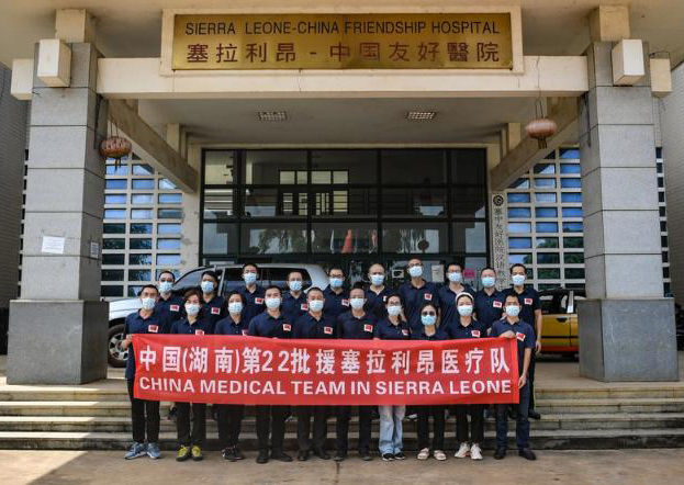↑2021年12月7日,在塞拉利昂塞中友好醫院,中國(湖南)第22批援塞拉利昂醫療隊即將結束任務回國之際,集體合影留念。