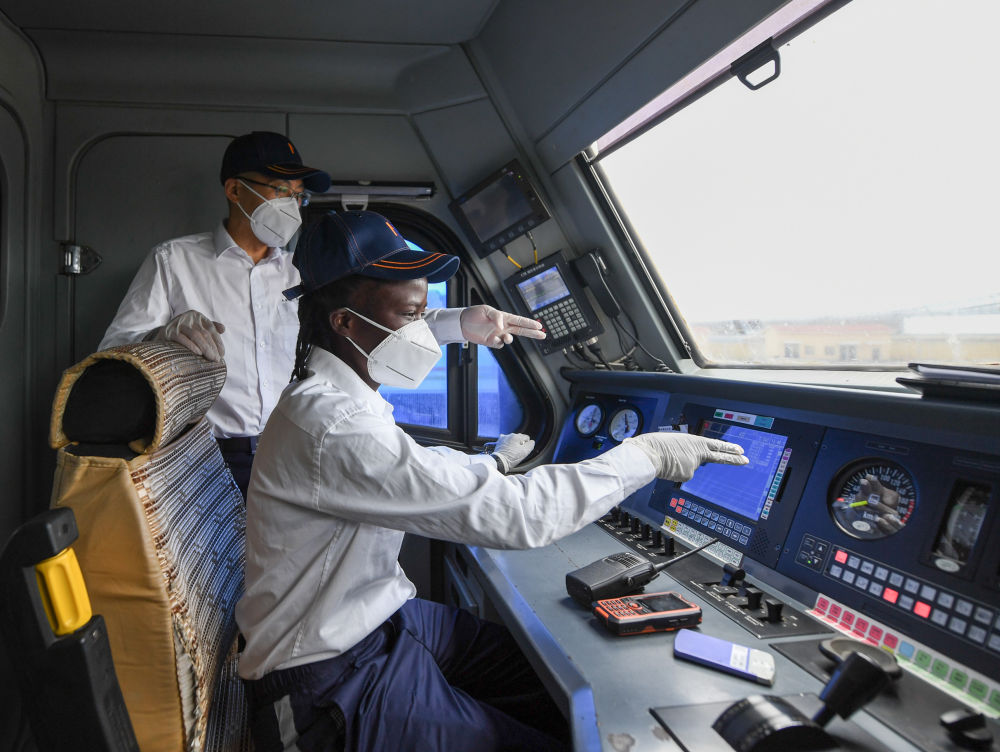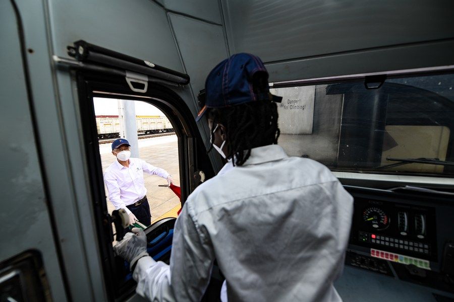 ↑2021年3月22日,在肯尼亞首都內羅畢,楊明和康西莉亞進行火車機車對接車廂工作。