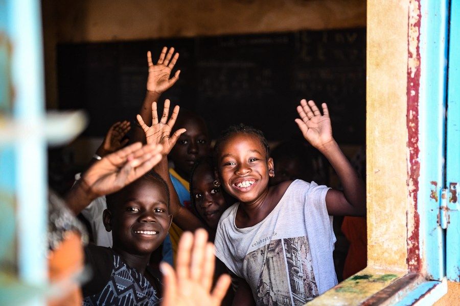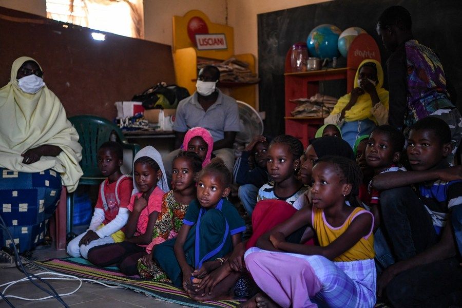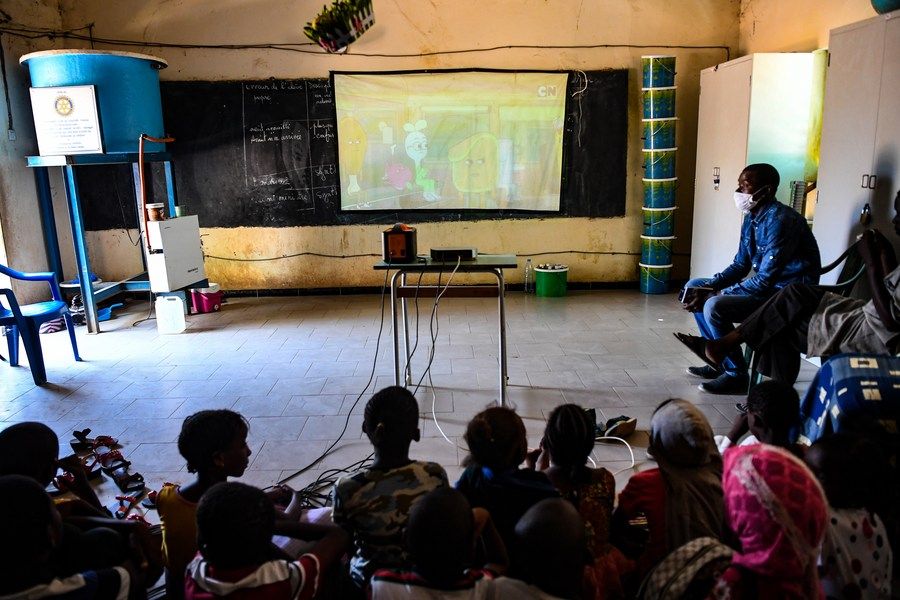 ↑2021年11月22日,在塞內加爾達喀爾近郊的辛迪亞小學,同學們坐在教室的地毯上觀看投影播放的動畫片。整套設備都是靠太陽能蓄電池供電。