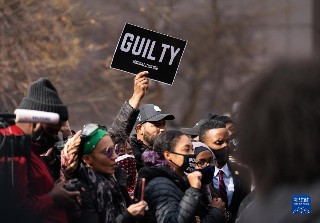 2021年4月20日,民眾手舉“有罪”的標語聚集在美國明尼阿波利斯市的法庭附近。當日,美國前白人警察德雷克·肖萬被控殺害非洲裔男子喬治·弗洛伊德案在明尼蘇達州明尼阿波利斯市宣判,肖萬被控的謀殺和過失殺人等三項罪名全部成立。