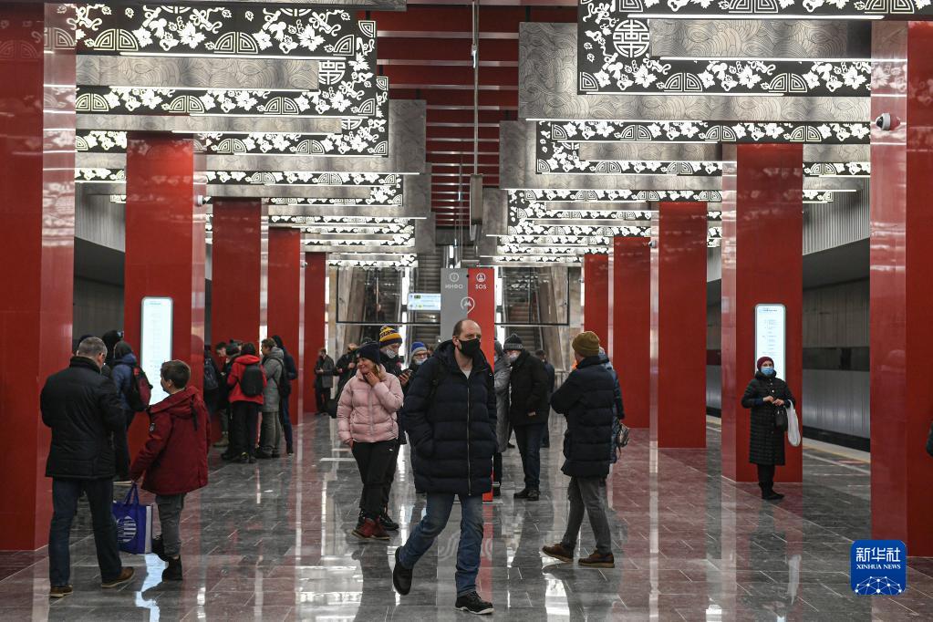2021年12月7日,乘客走在俄羅斯首都莫斯科地鐵第三換乘環線西南段的米丘林大街站內。莫斯科地鐵第三換乘環線西南段由中國鐵建中標建設,其中的米丘林大街地鐵站由紅色立柱、團壽紋、祥云等中國元素裝飾,成為中俄友誼的新地標。