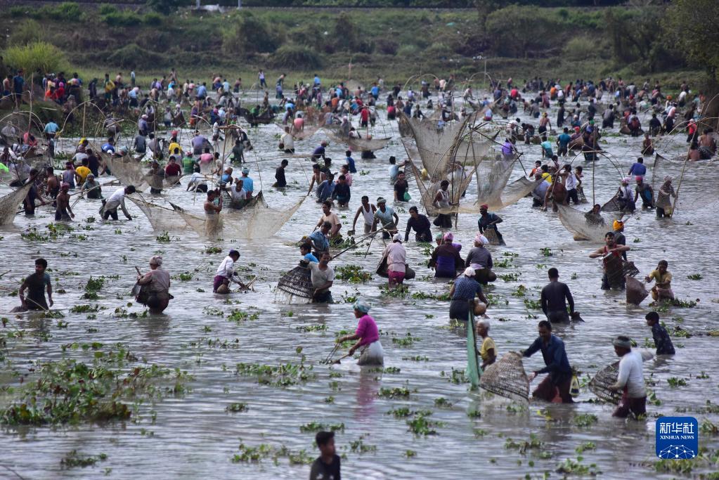 1月13日,在印度阿薩姆邦高哈蒂一處村莊,當地村民參加捕魚活動,慶祝收獲季的結束。新華社發