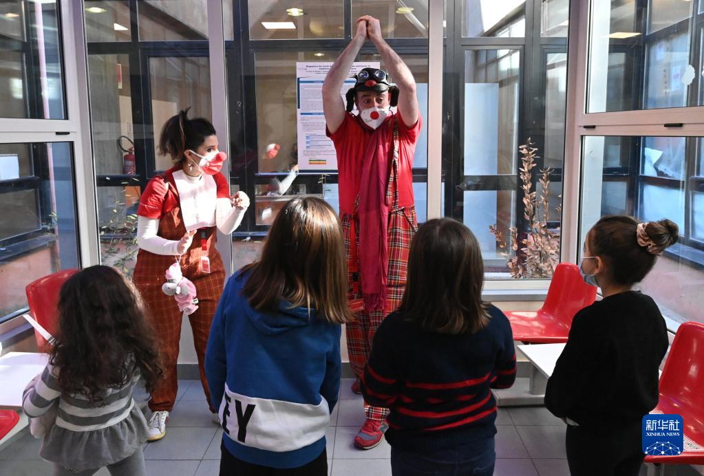 1月16日,工作人員扮成小丑在意大利博洛尼亞一處新冠疫苗接種中心與兒童互動。